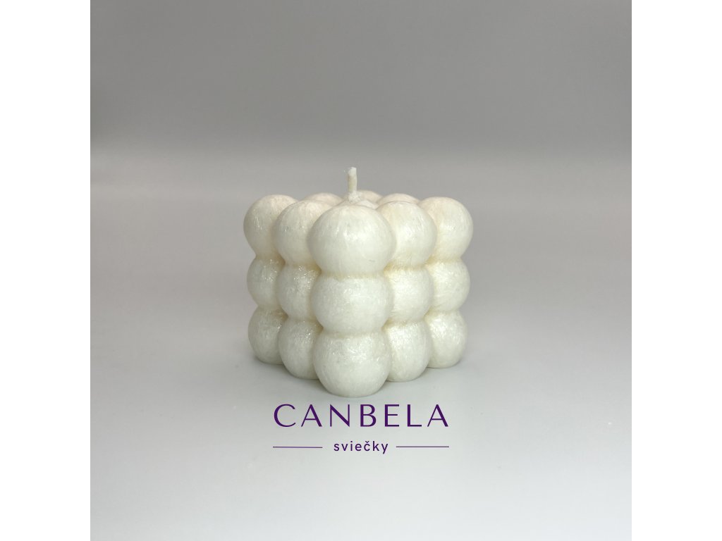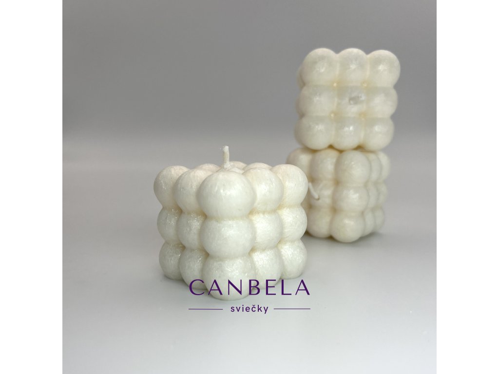 Dizajnová sviečka v tvare kocky ktorú tvoria guľky.